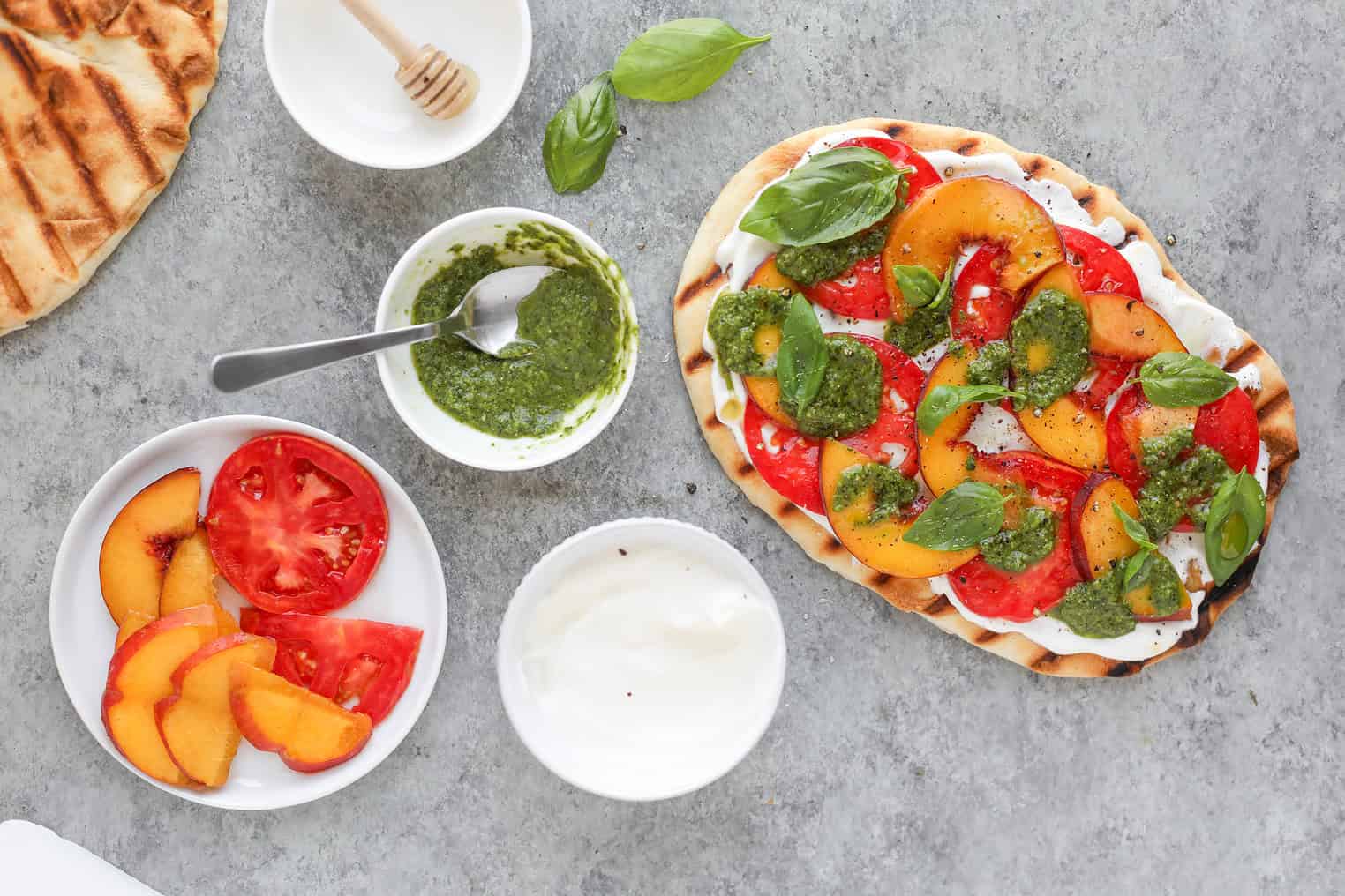 - Place the ricotta cheese in a food processor and puree until creamy and smooth. Spread the whipped ricotta on the flatbread, then layer with the thinly sliced peaches and tomatoes. Dollop with pesto and drizzle with honey.